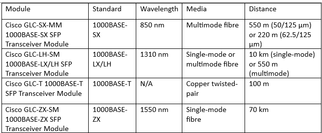 The table below summarizes the main differences between the Cisco GLC-SX-MM 1000BASE-SX SFP Transceiver Module and the other SFP modules mentioned above: